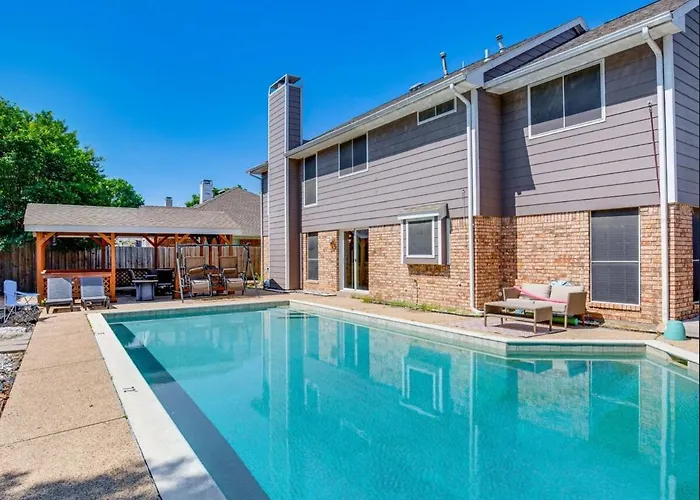 The accommodations at the **5 Bedroom House With Heated Pool Near DFW and Stadium** are designed for ultimate comfort, featuring five well-appointed bedrooms that promise restful nights. Each room is thoughtfully decorated and equipped with ample storage and plush bedding, ensuring you can unwind in style. The open-concept living area seamlessly blends modern aesthetics with a cozy ambiance, making it perfect for gatherings or quiet evenings in.
